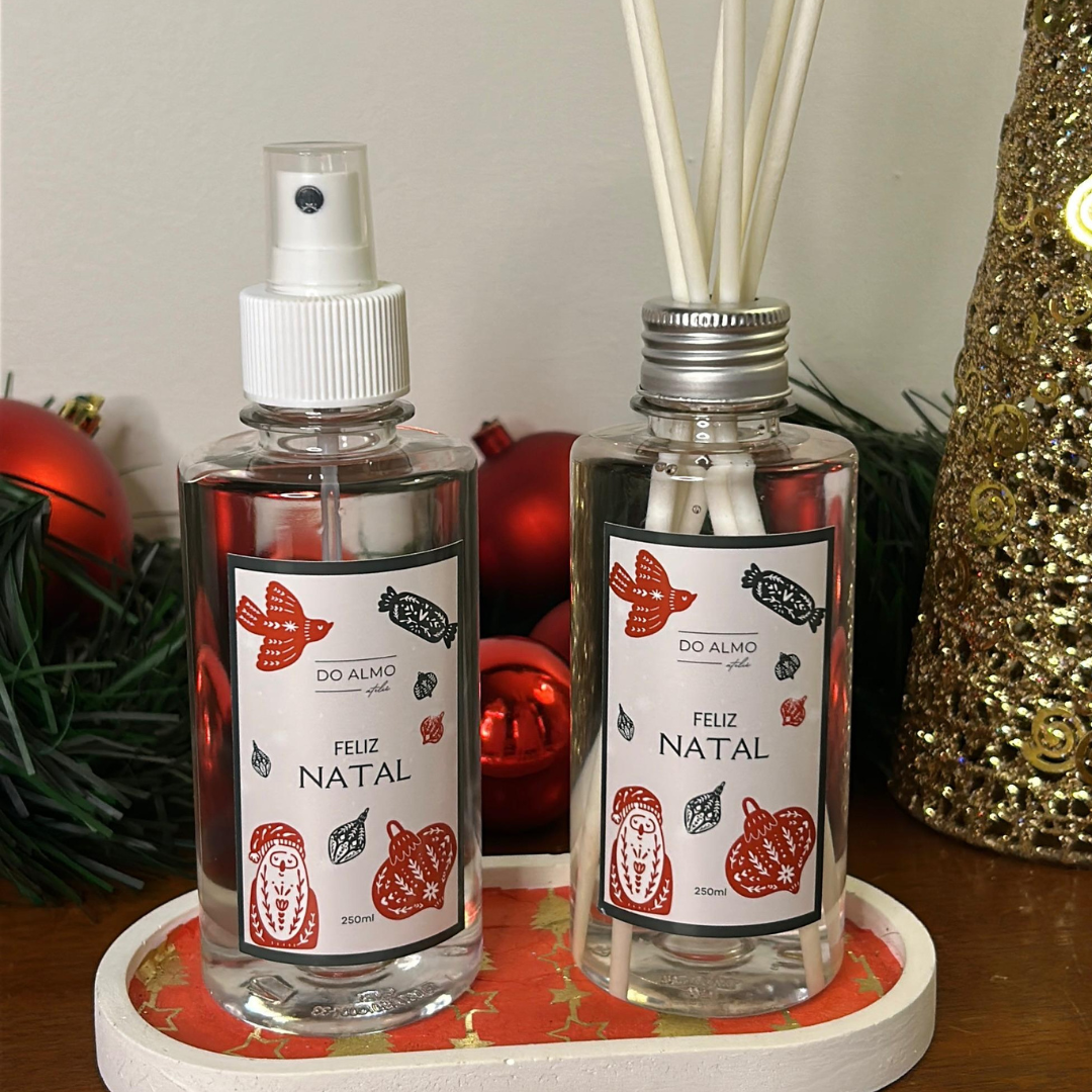 Nosso Kit Natal com Difusor e Home Spray reúne duas fragrâncias cuidadosamente selecionadas para transformar o seu ambiente: Feliz Natal: cereja & avelã; Boas Festas: pistache.